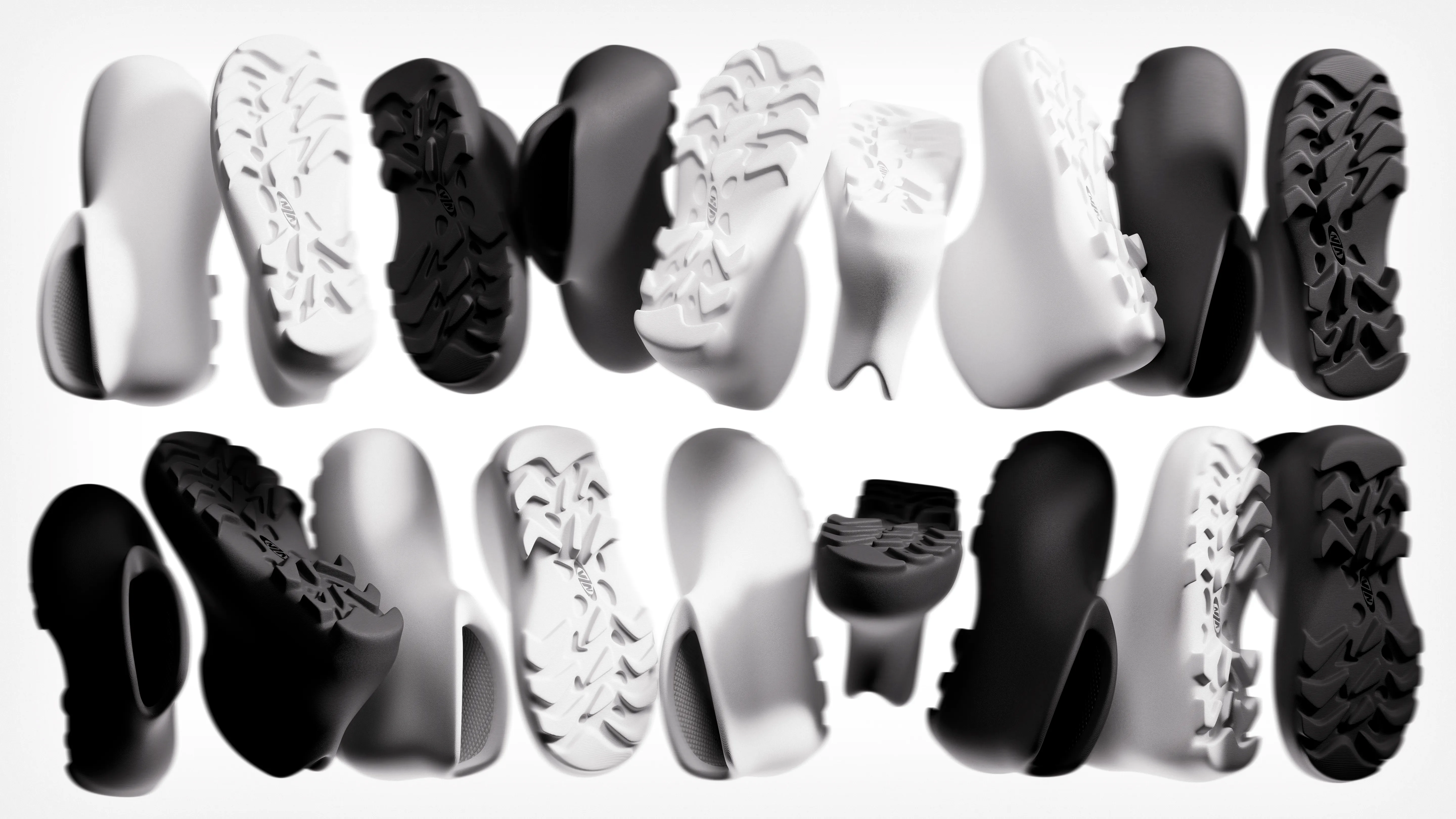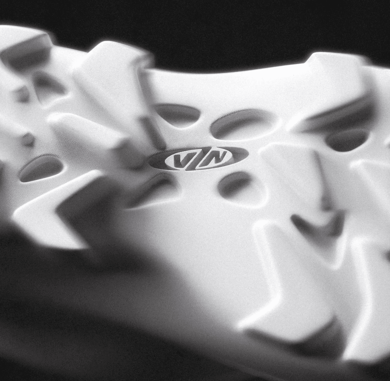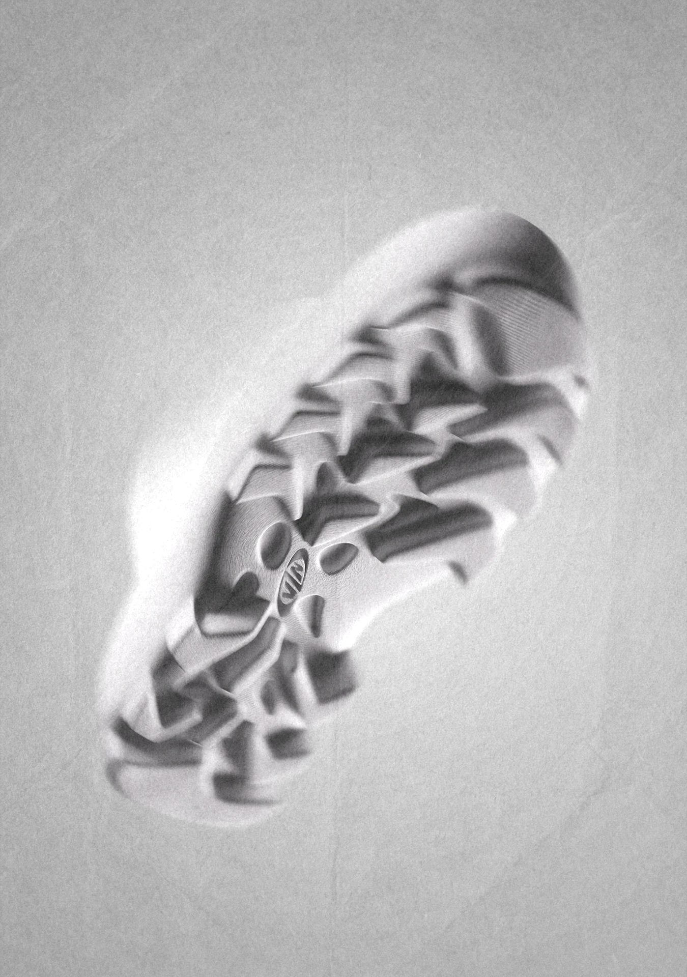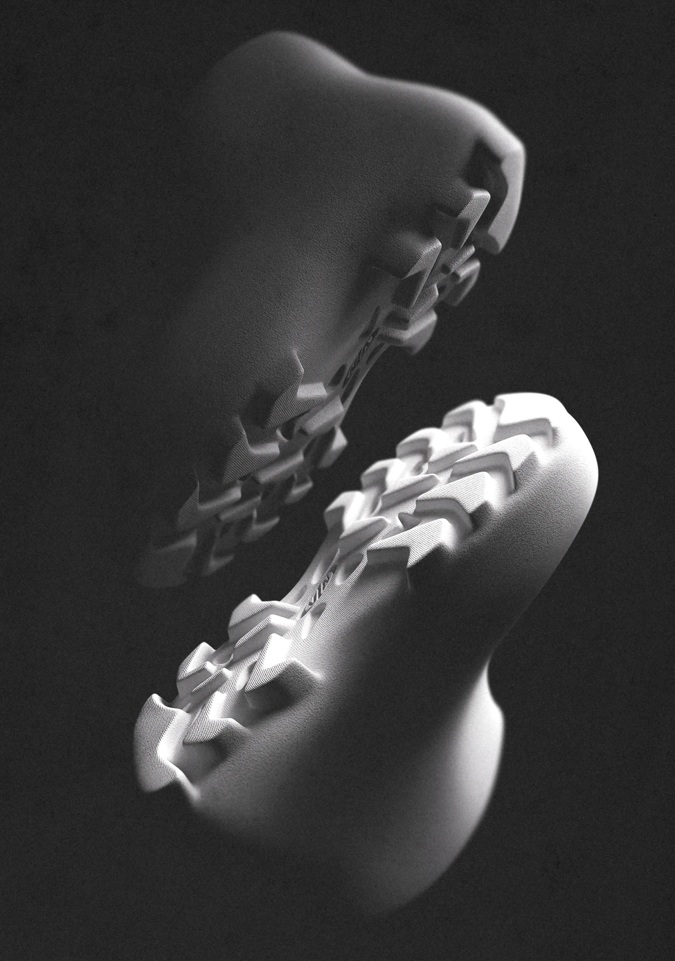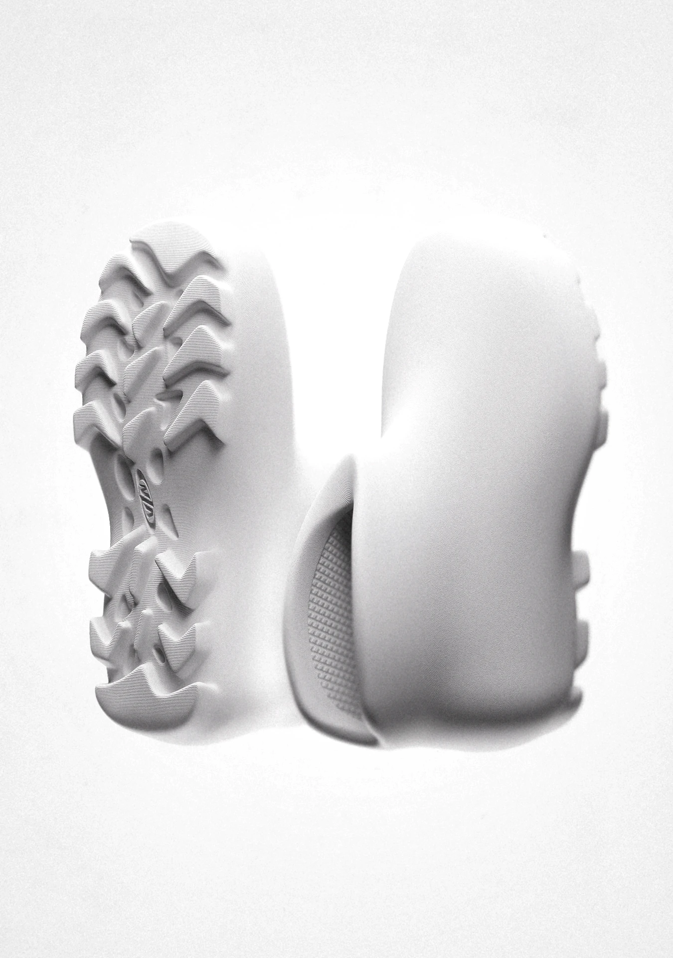 Visuales de producto centrados en la exploración de suela y volumen. Iluminación de estudio en alto contraste, con enfoque en textura, repetición y geometría. Materiales en blanco para aislar forma y detalle. Serie desarrollada como parte de investigación visual y dirección de producto.